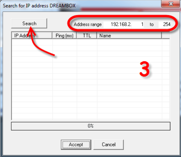 Note: If you know the correct IP address of your box and router, there is an empty space above the Search button. Mouse over there and type the IP address.